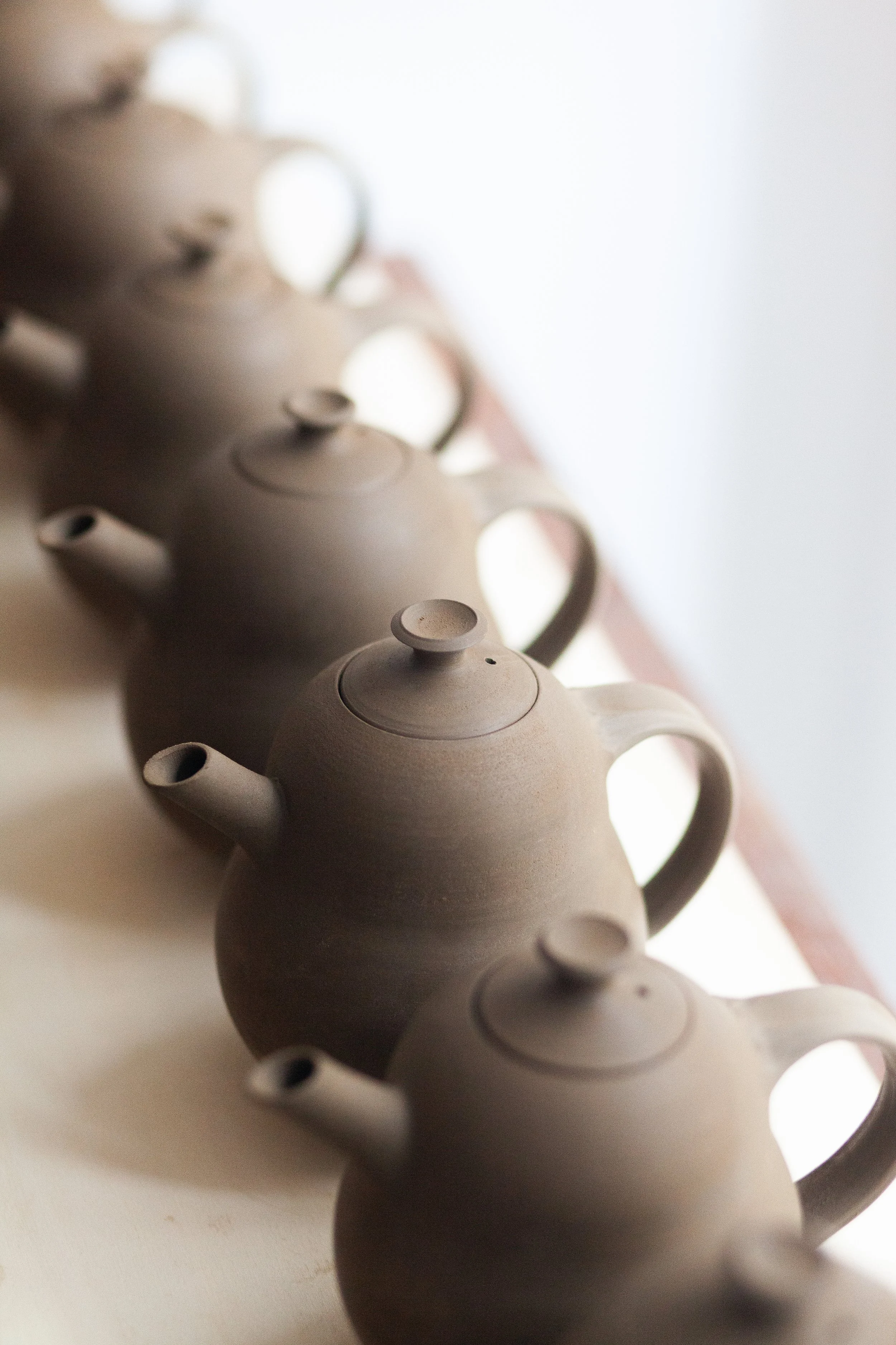 Émaillage et cuisson d’un ensemble composé d’une théière et d’une paire de tasses assorties.